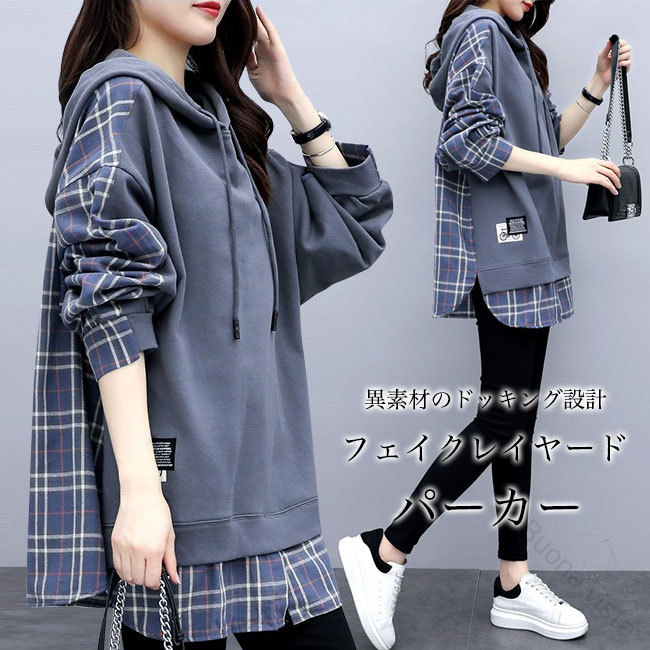スウェットパーカー レディース 長袖シャツ チェック柄 フェイクレイヤード パーカー オーバーサイズ ドロップショルダー カジュアルシャツ 長袖 春秋トップス プルオーバー 体型カバー ゆっ フード付