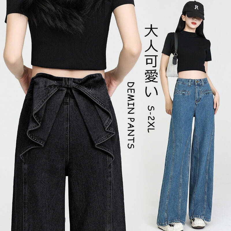 バックリボンデニムパンツ デニムパンツ ストレート ハイウエスト ステッチデザイン フリル付き 後ろ姿映え ボトムス パンツ 着回し力抜群 ロング 長ズボン ファッション 20代 レディースジーンズ