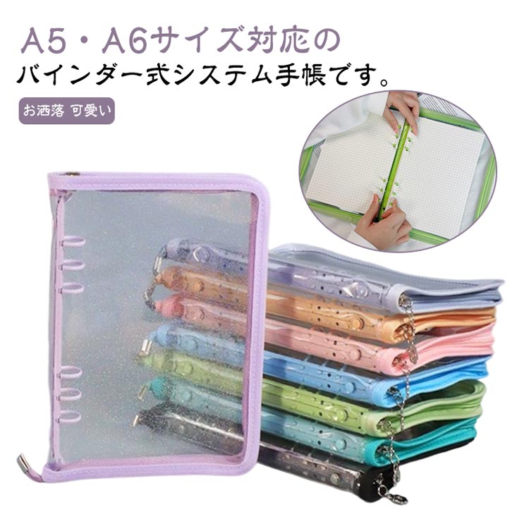 バインダー システム手帳 A5 A6 ルーズリーフ ファスナー付き 6穴リング ノートカバー 透明 収納ファイル 軽量 文房具 学生用 社会人 オフィス