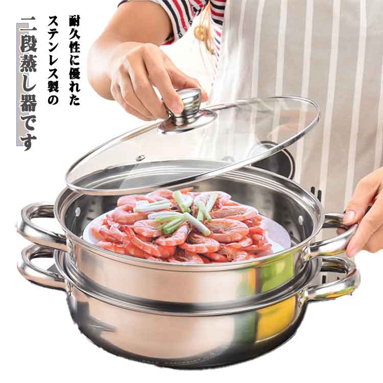 ステンレス 蒸し鍋 調理器具 二段蒸し器 二段 蒸し器 スチーマー キッチン せいろ 28cm 両手鍋 ガラス製蓋付 中華鍋 多用途 蒸し用プレート付属