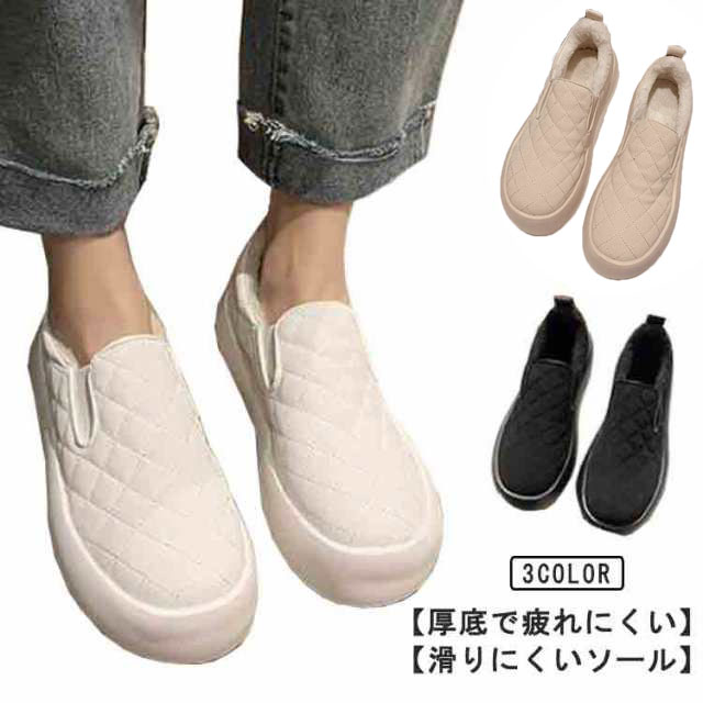 歩きやすい 裏ボア ぺたんこ ローカットスニーカー スリッポン フラットシューズ 冬靴 キルティング オシャレ マタニティ 厚底