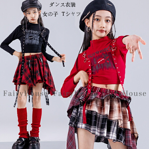 ダンス衣装 Tシャツ キッズダンス トップス 舞台 キッズ 子供 長袖 半袖 女の子 ジャズダンス へそ出し 長袖Tシャツ hiphop K-pop チェック柄スカート 団体服 チアリー 子供ダンス服