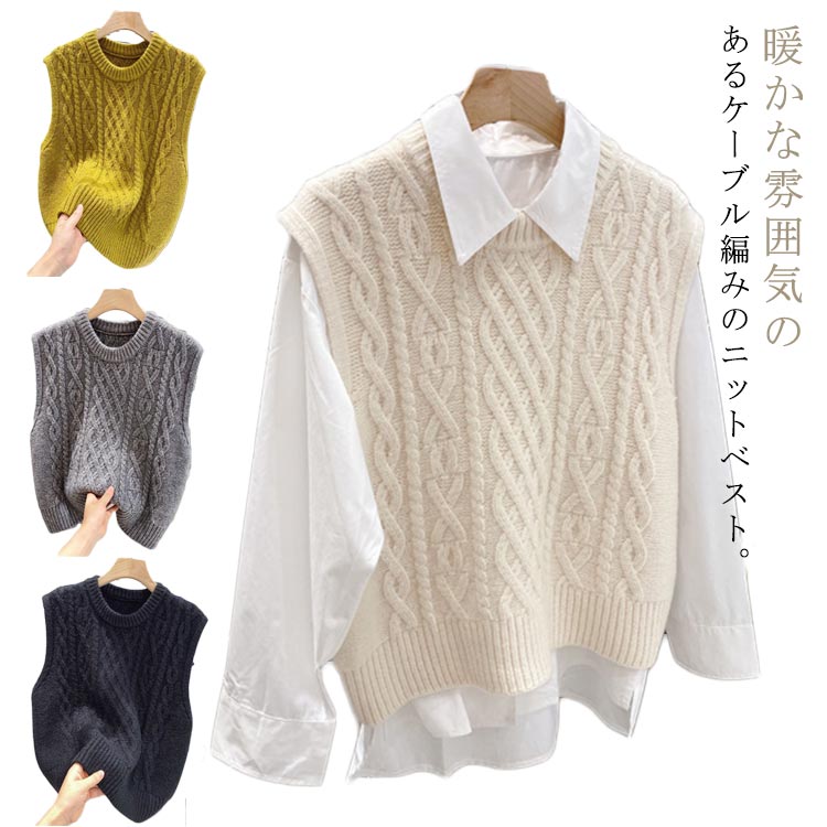 ニットベスト ケーブル編み クルーネック プルオーバー ニット ベスト トップス ノースリーブ きれいめ 韓国 ファッション