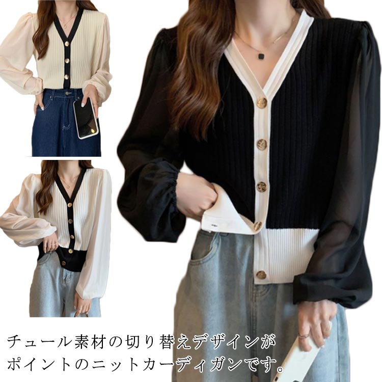 ニットカーディガン レディース 長袖 Vネック カーディガン チュール袖 切り替え バイカラー ボリューム袖 ニットカーデ 春 秋 トップス 羽織り 薄手 可愛い フェミニン 無地 大人カジュアル