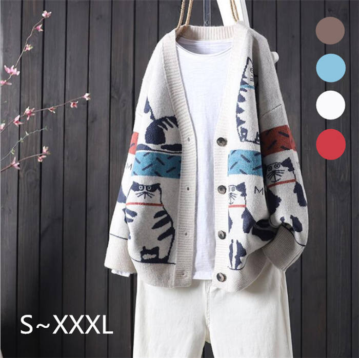復古風猫柄レディースカーディガンジャケットショット丈 シンプル 秋冬用スウエットトップス 重ね着 可愛い カジュ ニット