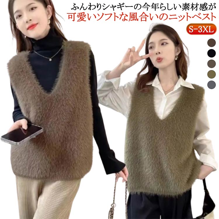 シャギー ベスト レディース ファーベスト もこもこ 秋冬 vネック ニットベスト レイヤード シャギーニット トップス 毛足長め フェイクファー 冬 セーター ノースリーブ お プルオーバー