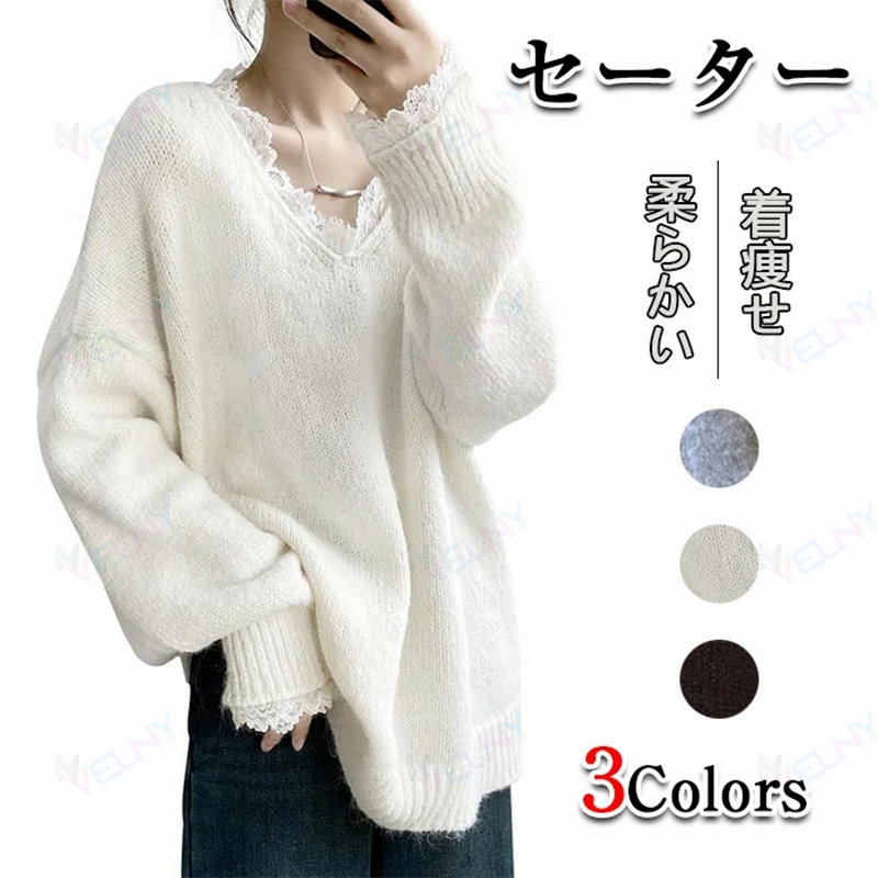 セーター レディース ニット vネック トップス 長袖 レース おしゃれ 可愛い ゆる感 着痩せ 体型カバー 伸縮性 柔か 暖かい 防寒対策 重ね着 ニットソー 通勤 秋 冬 普段着